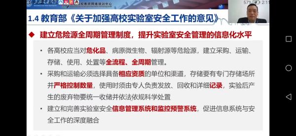 视频会上,教育部高等教育司宋毅副司长主持开班仪式,并对教育部组织本次培训班的目的及重要意义提出了要求。东南大学实验室与设备管理处熊宏齐处长分析了高校教学实验室安全问题,并分享学生实验环节准入培训经验;华东理工大学安全环保办公室徐宏勇主任围绕“以人为本”的实验室安全数字化管理方面作了交流;杭州电子科技大学自动化学院副院长姜周曙介绍了实验室安全标准化、信息化、数字化和智能化工作的基本情况;上海交通大学材料科学与工程学院副院长冯传良作了《高校危险化学品全流程的信息化管理》报告;广州实验室高级实验师于学东教授介绍了高校实验室生物安全基础;江南大学实验室与设备管理处长刘仁以江南大学为例介绍了以信息化助力下的高校实验室安全管理体系构建和实施方面的宝贵管理经验。