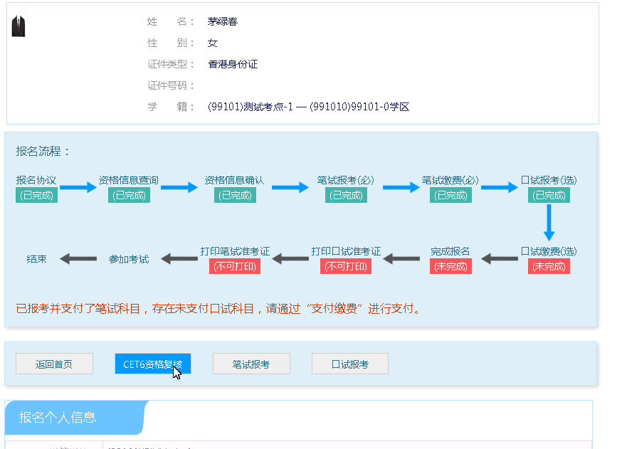 考生可以在这个页面,检查自己的照片和基本信息是否正确,查看自己的报考资格科目和进行CET6资格复核申请。