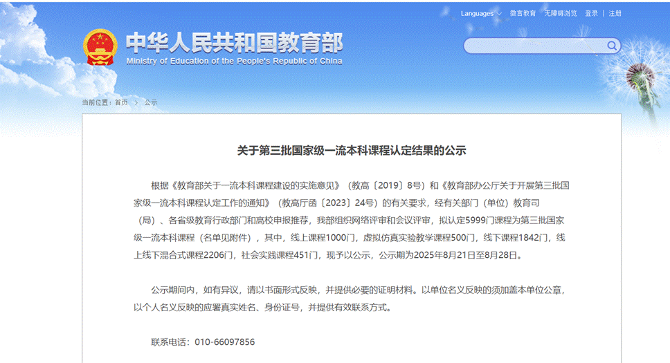 近日,教育部高等教育司发布的《关于第三批国家级一流本科课程认定结果的公示》,拟认定5999门课程为第三批国家级一流本科课程,包括线上课程1000门,虚拟仿真实验教学课程500门,线下课程1842门,线上线下混合式课程2206门,社会实践课程451门。154所民办高校的234门课程入选公示,其中线上课程12门,虚拟仿真实验教学课程10门,线下课程64门,线上线下混合式课程118门,社会实践课程30门。其中,江西7所民办院校,10门课程入选。