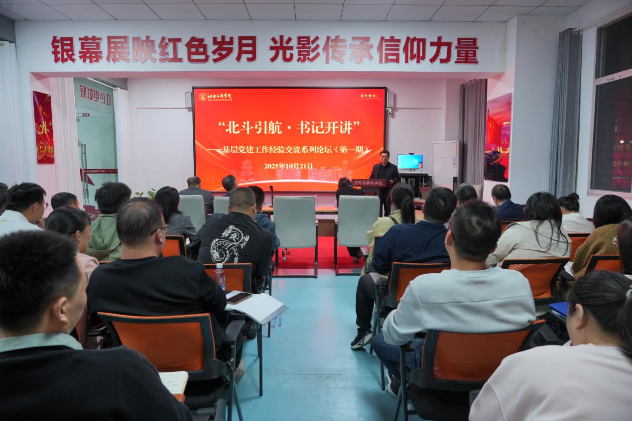 10月21日晚,以“书记讲给书记听”为主题的“北斗引航·书记开讲”基层党建工作交流系列论坛(第一期)在天工校区“一站式”学生社区红色影院成功举办。校党委书记、督导专员魏建克,党委委员、副校长沈良出席会议并讲话。马克思主义学院直属党支部书记于永清作首期分享,各党总支(直属党支部)书记、副书记、各支部书记、专职组织员共50余人参加论坛。论坛由党委委员、党委组织部部长熊文珍主持。